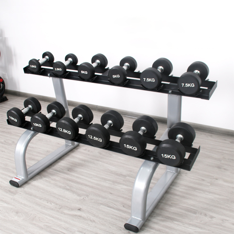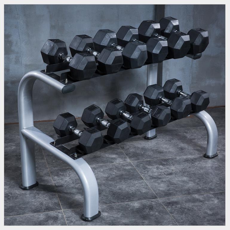 Стойка для гантелей имеет два яруса и вмещает 10 пар гантелей. Она была разработана без острых краев, которые потенциально могли бы порвать ваши гантели. Резиновая накладка на основание, чтобы не царапать пол. Широкие бортики позволяют легко вставать и сходить со стойки. Прочная стальная конструкция для долговечности и использования в любом спортзале