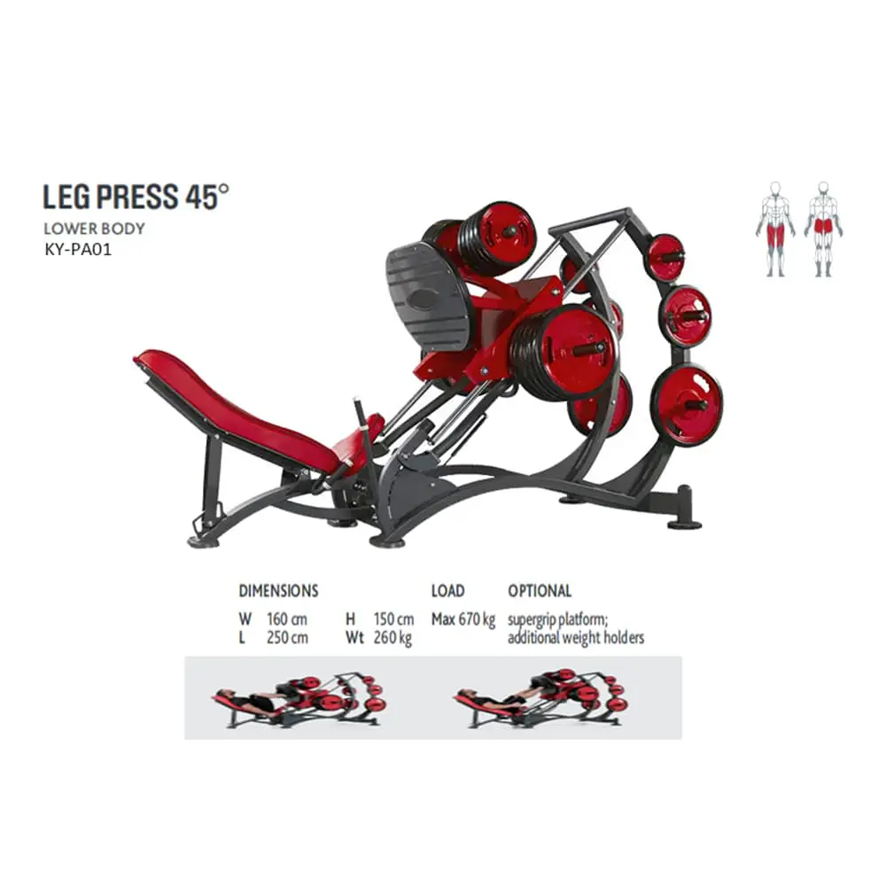 GANAS SUPER LEG PRESS 45° — это коммерческое фитнес-оборудование, предназначенное для тренировки мышц ног. Он имеет дизайн под углом 45°, направленный на усиление тренировочного эффекта мышц передней части бедра и ягодиц под определенным углом. В то же время высококачественные материалы и тонкое мастерство гарантируют стабильность и долговечность оборудования. GANAS SUPER LEG PRESS 45° подходит для коммерческих спортивных залов, частных тренировочных залов, спортивных клубов и других мест. Будь то профессиональные фитнес-специалисты или обычные любители фитнеса, с помощью этого оборудования они могут добиться эффективной и безопасной тренировки мышц ног.